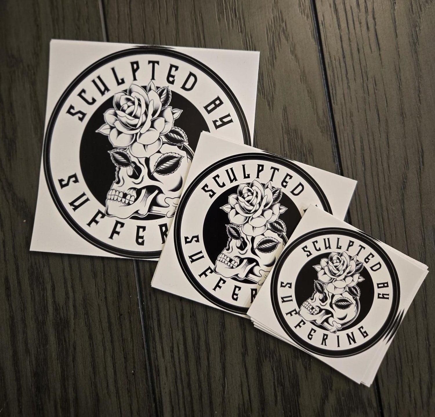 The classic Sculpted by Suffering logo, available in 3 sizes of high-quality stickers.